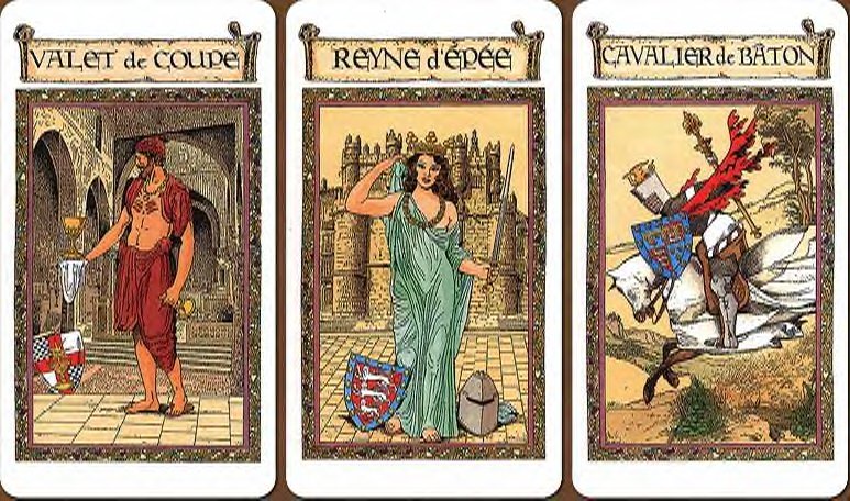 only part of the Minor Arcana text that I've translated. Each suit displays a symbolic progression. The suit of Coins, for example, represents the following: Ace, Positive results and integral solidity of ongoing projects; Two, Creative desire; Three, Positive change of orientation required by destiny; Four, Creative power; Five, The cosmic forces accompanying the action; Six, Sign of delay because of hesitancy before decisions; Seven, The force leading to success is omnipresent; Eight, Interesting outcome but the path is difficult; Nine, Positive result differed because of calm reassuring of the energetic context; Ten, Excellent achievements, and great satisfactions are announced. The court cards consist of the Valet (Servant), Cavalier (Knight), Reyne (Queen) and Roy (King). Although very detailed, the costumes and locations are probably more theatrical fantasy than historical fact. Heraldic crests have been added into many of the designs. This kind of detail leads me to wonder of there is more historical allusion in this deck than I am aware of. This deck is beautifully illustrated, and uses earthy tones to imply the sense of antiquity. The cards are sturdy, the printing is crisp, the entire package is well done. The Tarot of the Templars seems to be currently available in France. You may be able to purchase a copy through Yves Daniel, a wonderful merchant for French decks. |